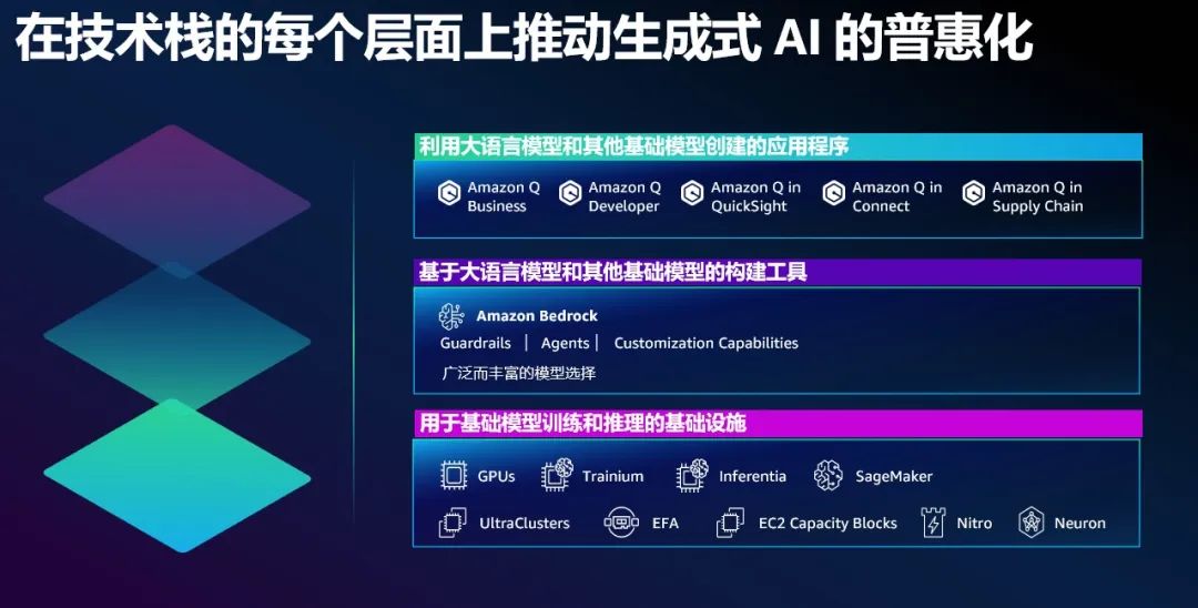 亚马逊云科技不断完善,为客户提供从算力设施、基础模型、构建工具到上层应用的完整生成式AI技术堆栈。