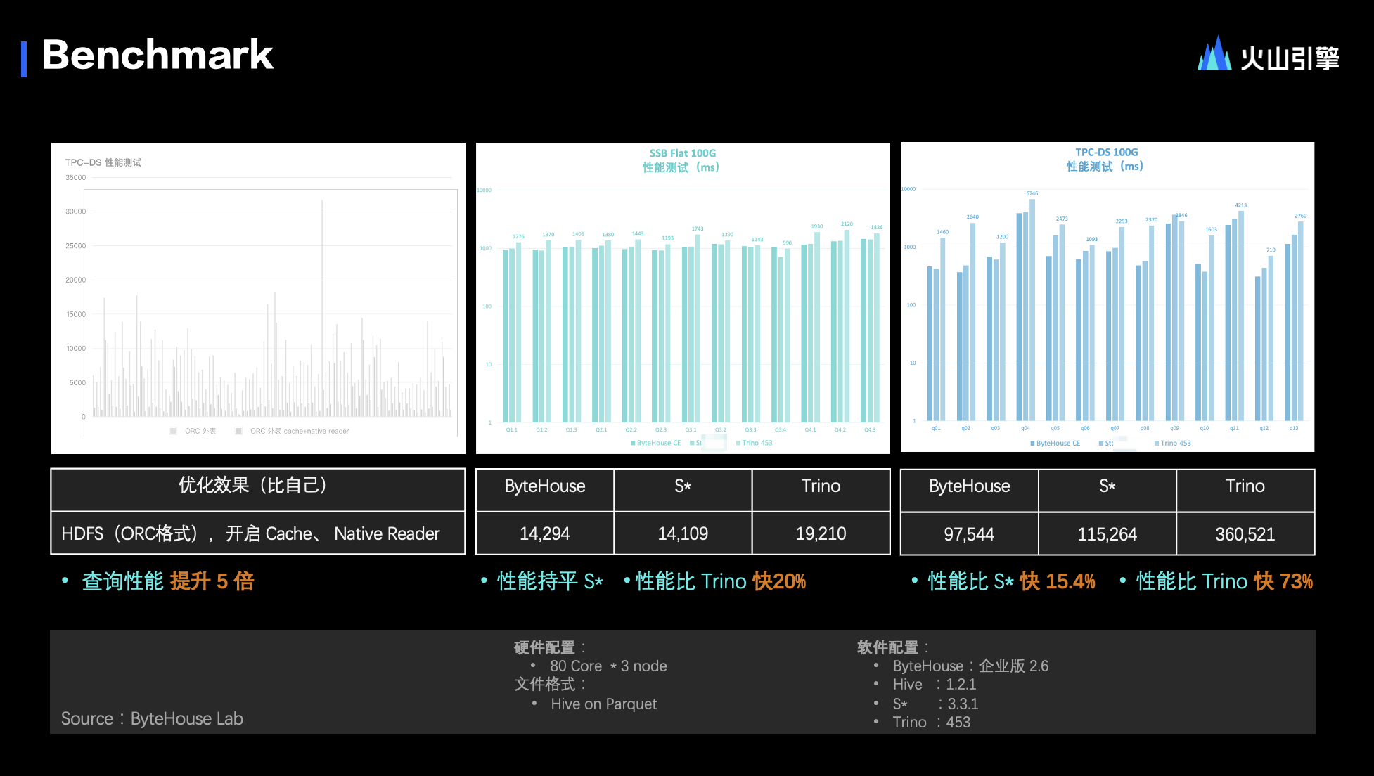 首先,第一个 Benchmark 是自己与自己对比的测试场景。在这个场景中,ByteHouse TPC-DS 所有数据都以 ORC 格式存储在 HDFS 分布式文件系统中。在此基础上,我们启用了之前提到的 Cache 能力和第一个 native reader 能力。开启这两个功能后,性能优化效果显著,直接提升了五倍。