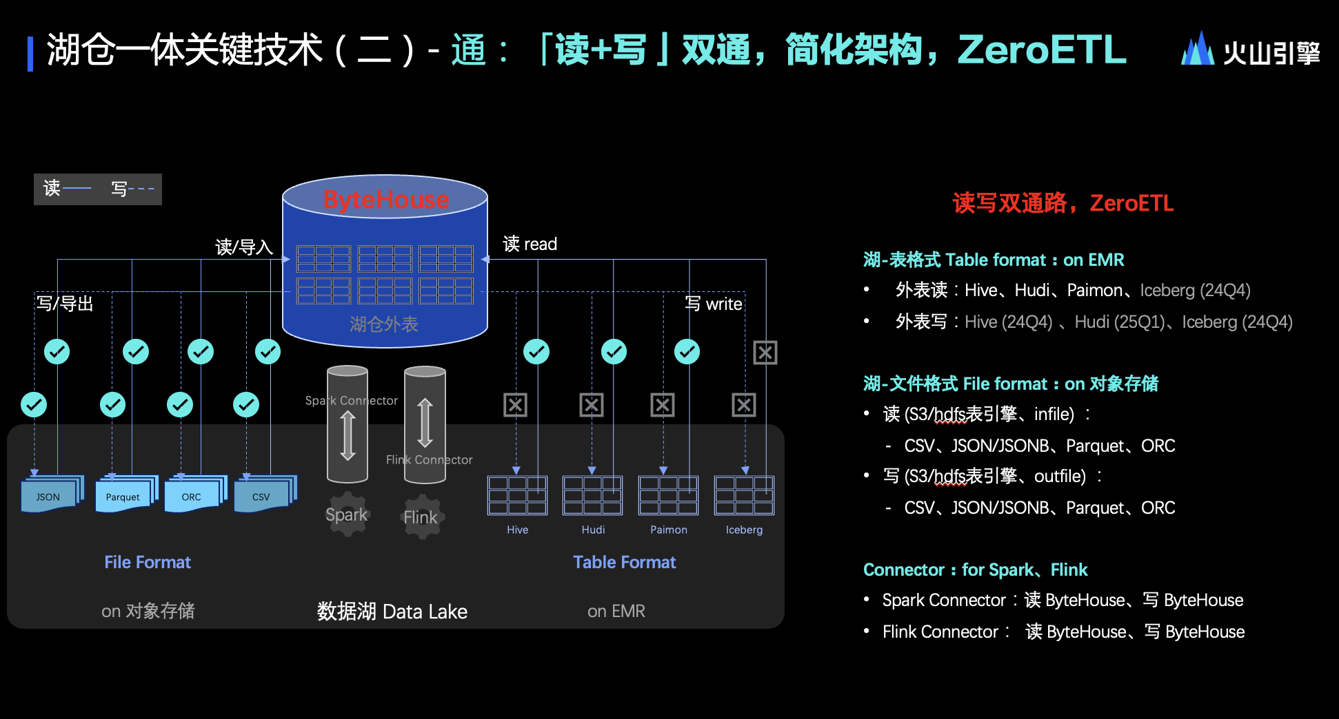在应用层面,比如 AI 领域,很多数据清洗工作都采用了这种模式,将数据存储在对象存储上,然后利用 Spark 引擎或其他 Reader 引擎进行直接读取。在这个流派中,ByteHouse 已经实现了读写的双向互操作性。