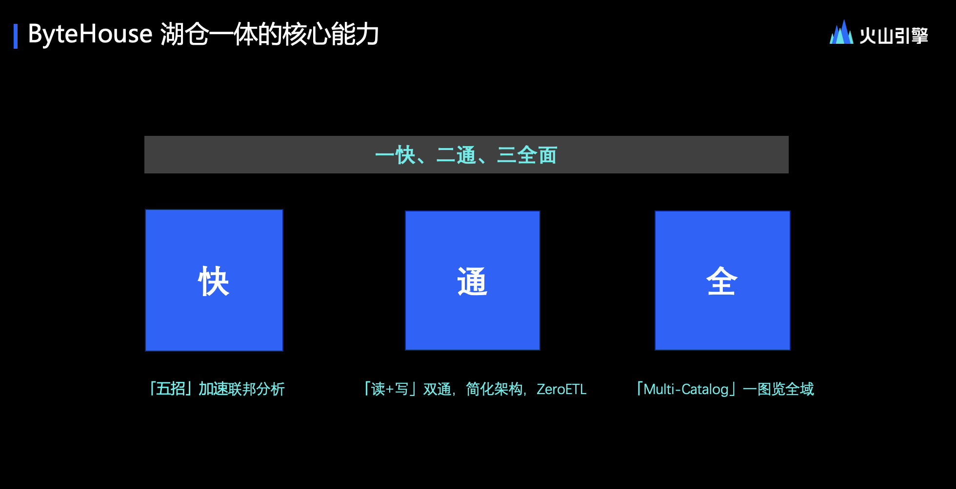 接下来,将深入介绍 ByteHouse 在湖仓一体化方面的核心能力——快、通、全。
