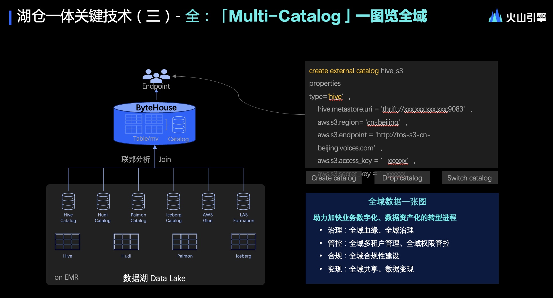 最后,“全”意味着 ByteHouse 能够通过站在“仓”的视角,预览并通览全局数据架构中的高价值数据,包括仓、湖、数据集市等,这也是 ByteHouse 在湖仓一体方面持续增强的能力。简单来说,就是更快、更融通以及更全面。通过 Multi Catalog(多元数据管理能力),做到一图览全域的效果。