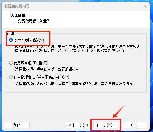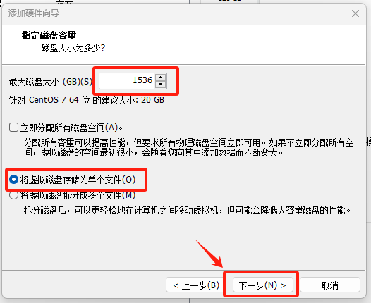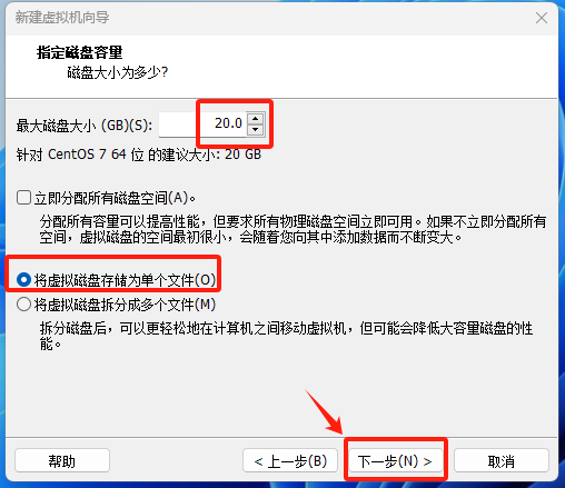 磁盘大小给20G(不用给大,后续结合实际挂盘),选择将磁盘存储为单个文件(方便后续移动)