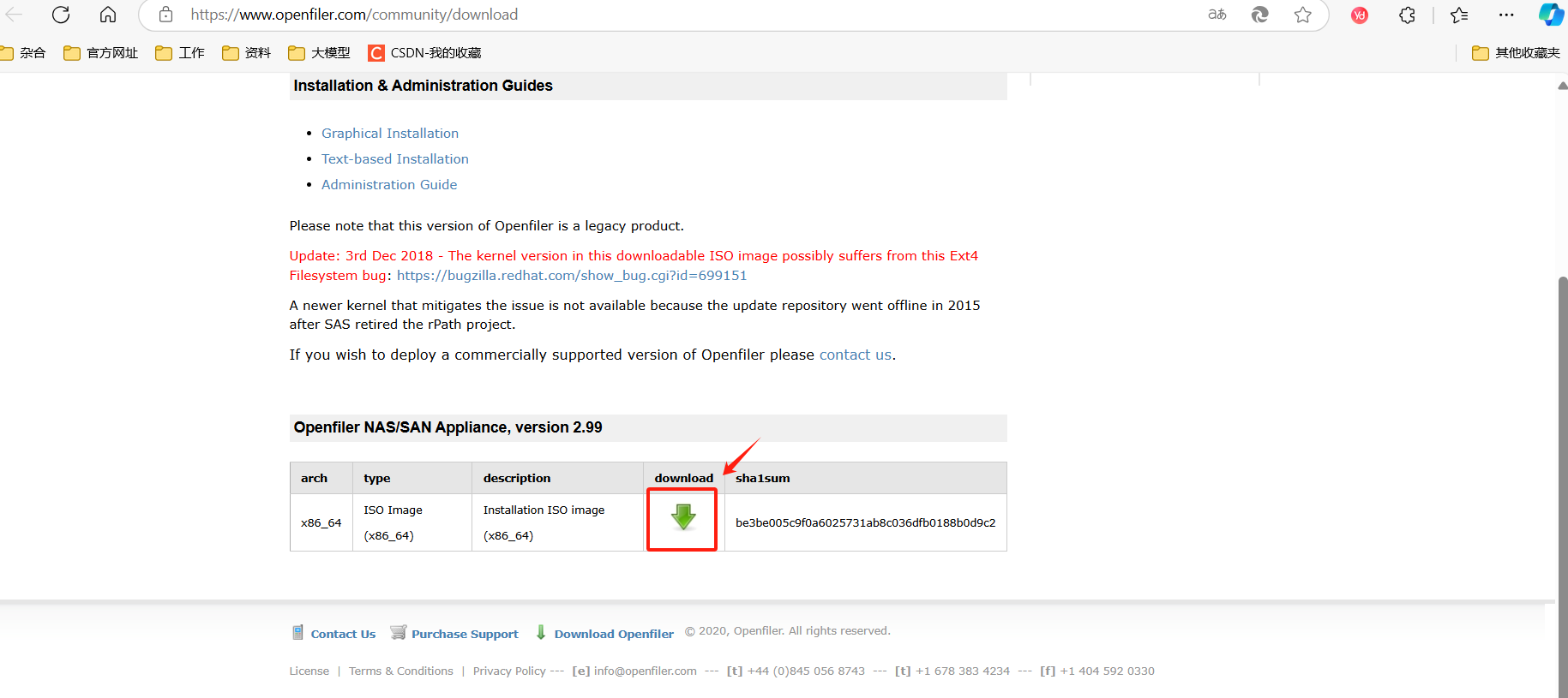 从官方网址下载相应的镜像包,openfiler 2.99官方下载地址。点击绿色下载即可。