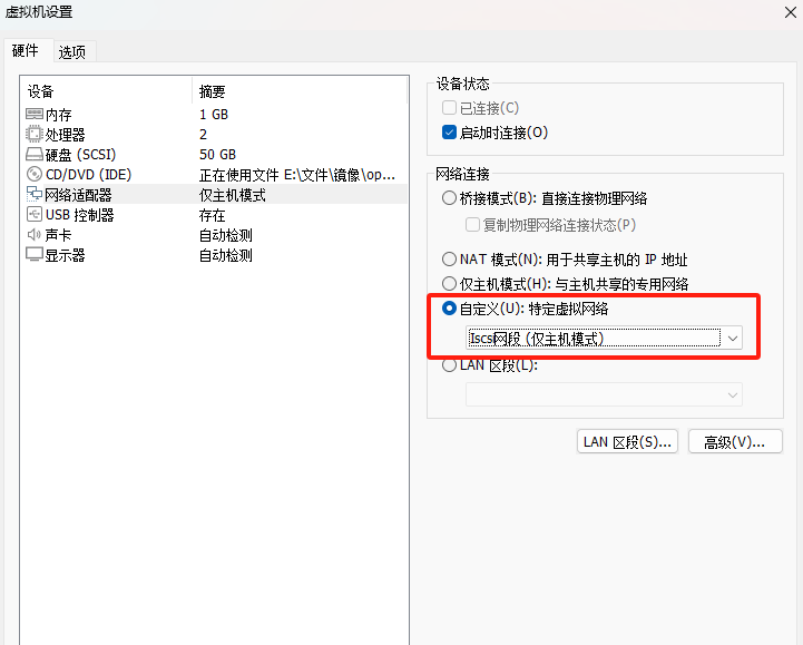 注意:还需要修改“网络适配器”,选择刚才创建的“Iscsi网段”网卡。配置完成点击右下角确定即可。