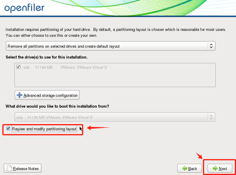 记得选中“Review and …”(即选中 重新构建和修改分区布局),点击“next”