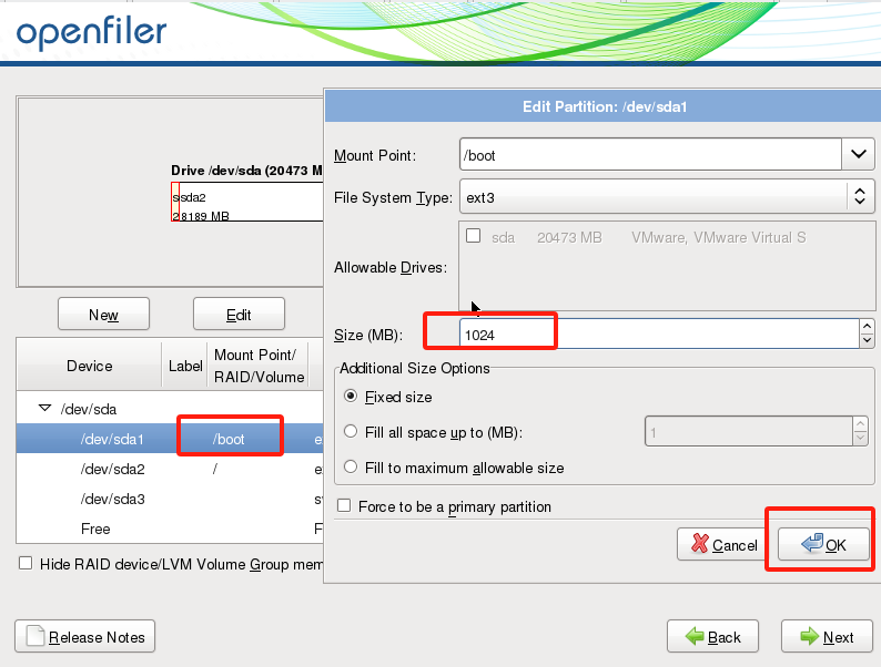 点击”/boot“配置大小为1024 点击“ok”即可。