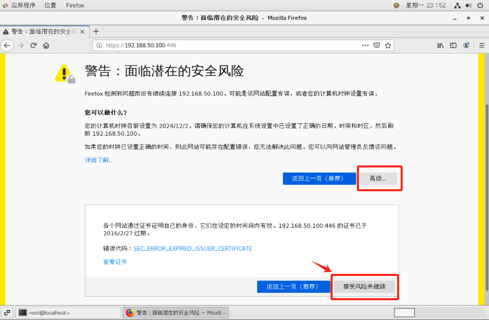 火狐中提示存在风险,点击“高级”后点击“接受风险并继续”。
