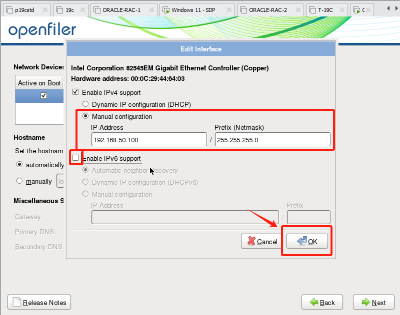 在弹出窗口中选择“Manual config…”,在下方输入刚才配置的“Iscsi网段”的IP信息,并取消选中下方的IPv6。点击“ok”即可。