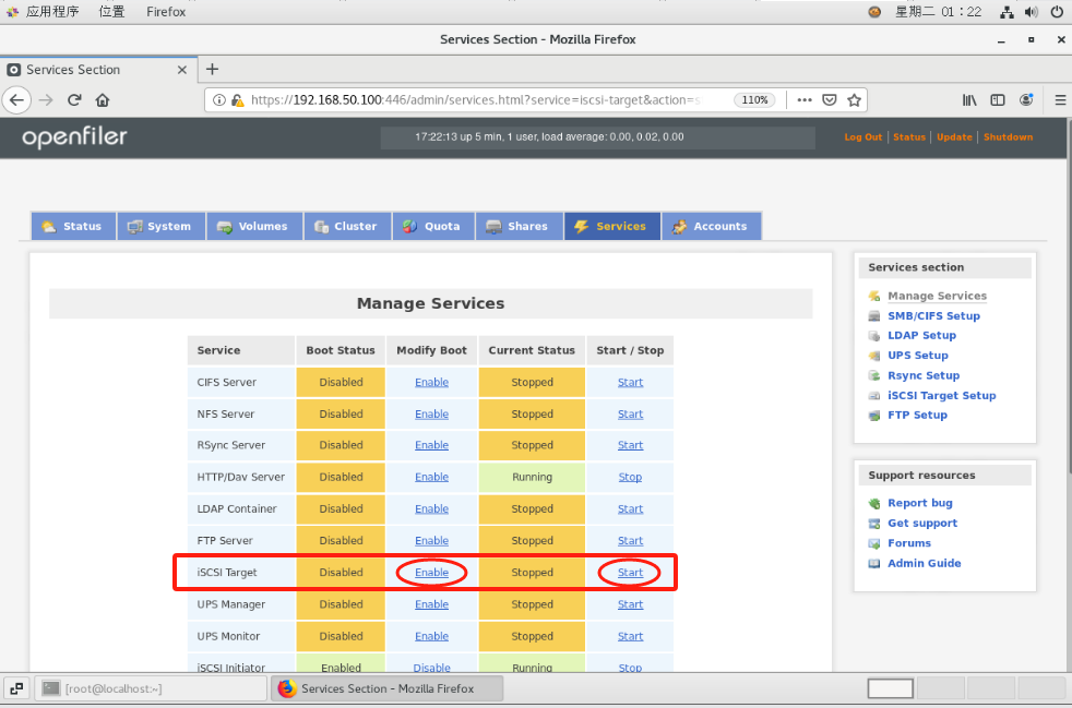 找到“iSCSI Target”,点击enable以及start。开启相应服务。同样开启