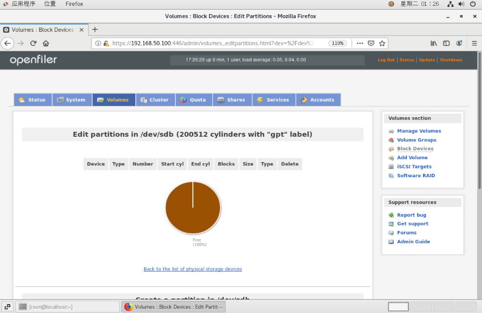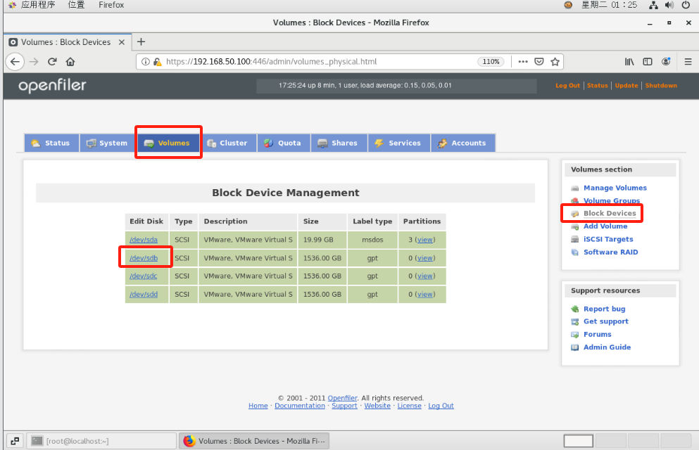 点击“Volumes”,跳转后点击右侧“ Block Devices ”跳转到以下界面后点击“ /dev/sdb ”。