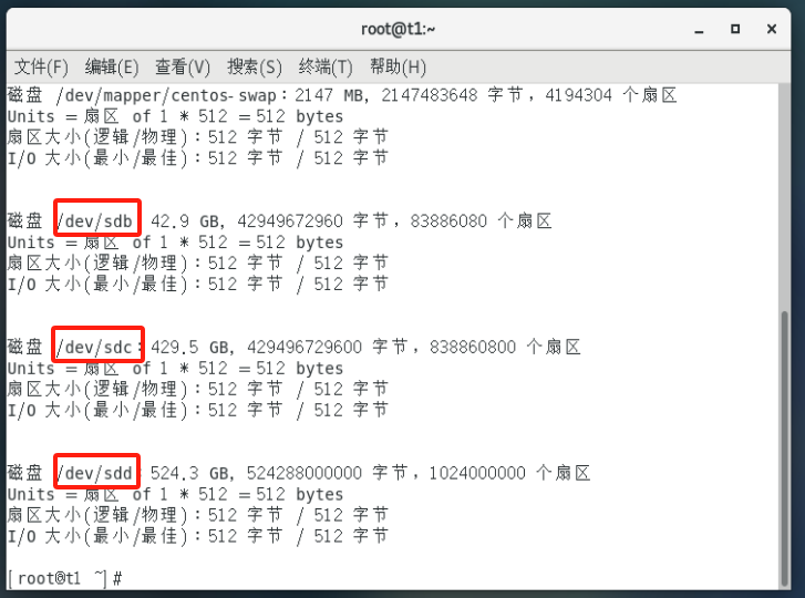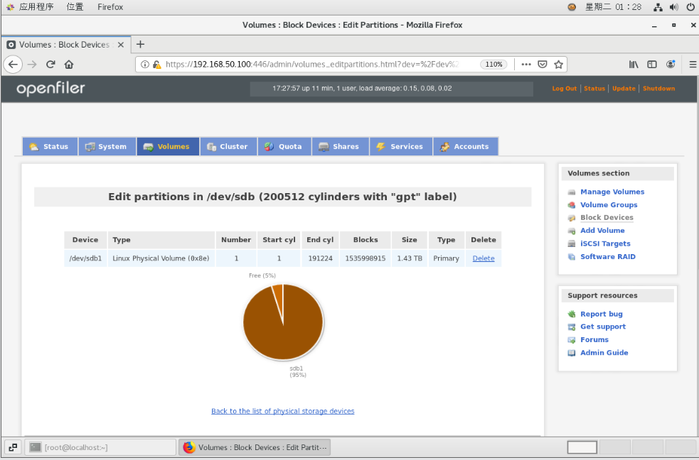 执行fdisk -l,发现/dev/sdb、/dev/sdc、/dev/sdd是通过iSCSI访问openfiler而获得的磁盘。
