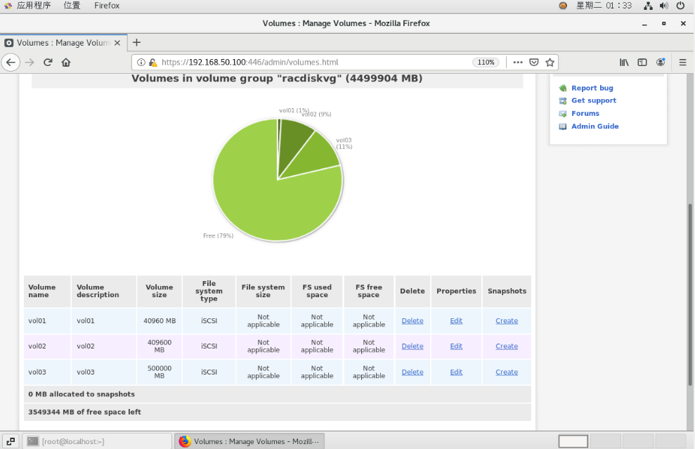 往下滑动,依次填写卷名称,空间大小为4096,卷类型选择"block(iSCSI,FC,etc)”。填写完毕后点击下方“create”创建vol01卷。