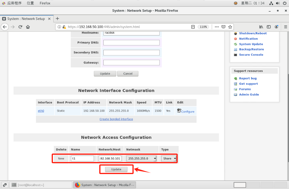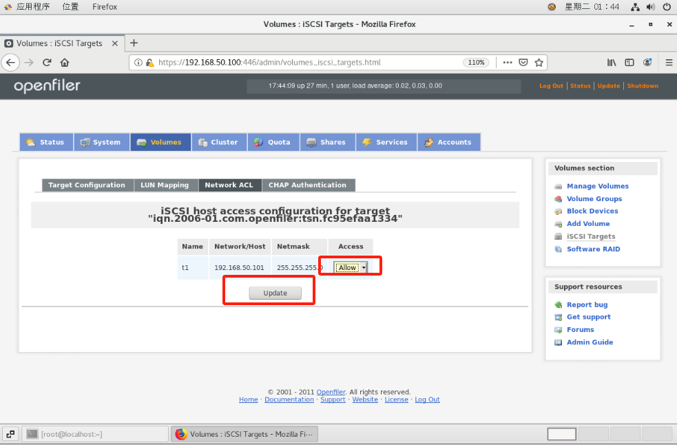 跳转后下滑网页, 填入要访问Openfiler的服务器名字t1,Network/Host地址为 192.168.50.111,Netmask 为 255.255.255.0(信息和用于测试的主机信息一致即可)点击 “Update”