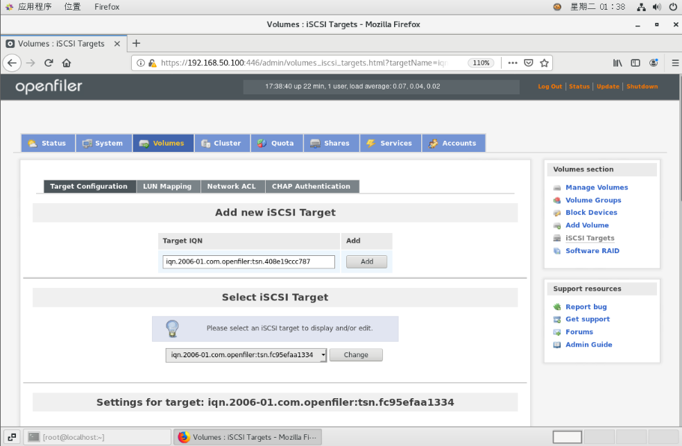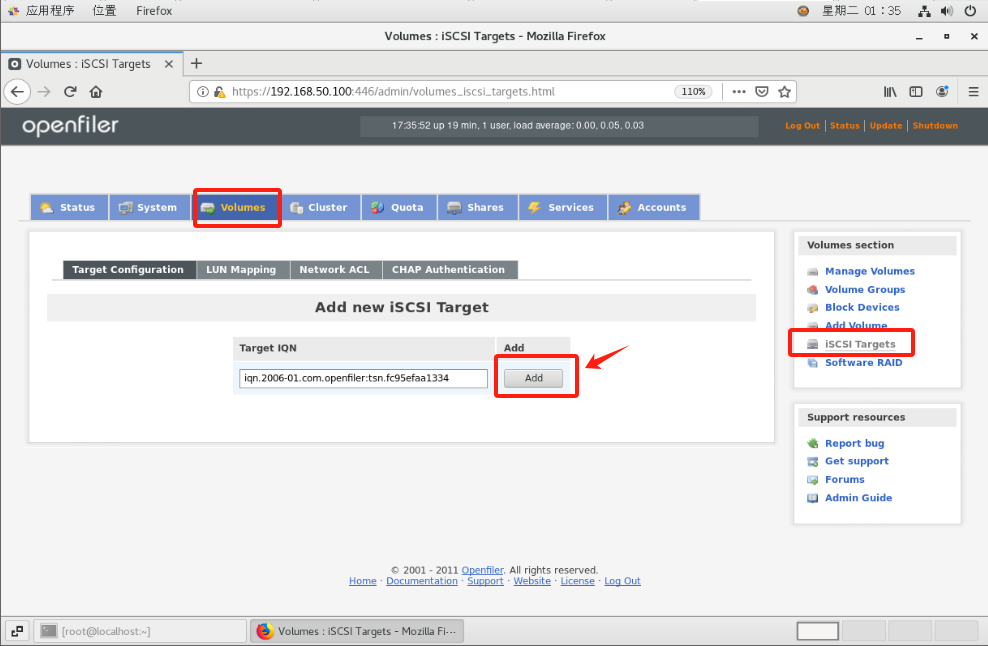 点击上方“ volumes ”,点击右侧“iSCSI Targets”,点击“add”