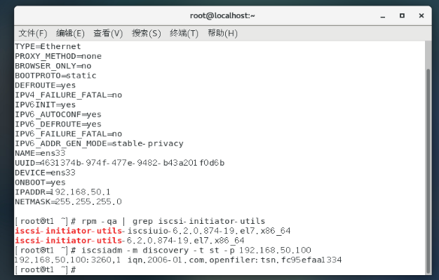 执行<font style="color:red;">iscsiadm -m discovery -t st -p 192.168.50.100</font>查看是否能检测到