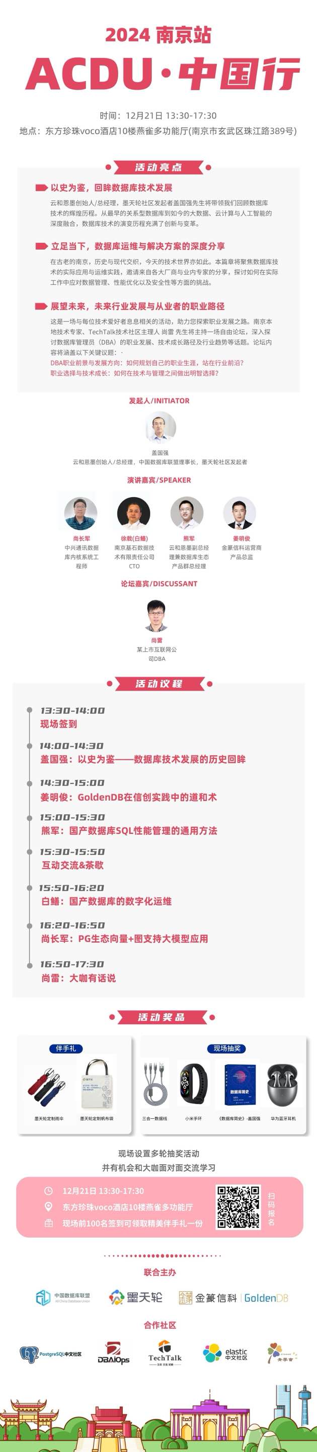 预告一下:在12月21日即将举行的【ACDU·南京站】活动中,金篆信科运营商产品总监姜明俊将带来《GoldenDB在信创实践中的道和术》的主题分享,期待与会者共同探讨数据库技术的创新与发展趋势。