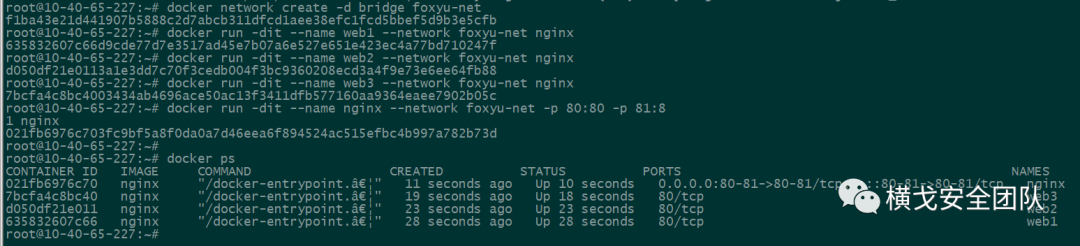 docker run -dit --name web1 --network foxyu-net nginxdocker run -dit --name web2 --network foxyu-net nginxdocker run -dit --name web3 --network foxyu-net nginxdocker run -dit --name nginx --network foxyu-net -p 80:80 -p 81:81 nginx