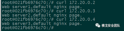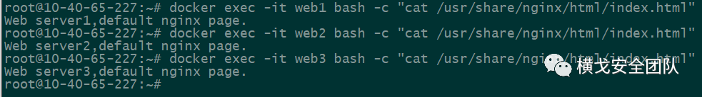 docker exec -it web1 bash -c "echo 'Web server1,default nginx page.' > /usr/share/nginx/html/index.html"docker exec -it web2 bash -c "echo 'Web server2,default nginx page.' > /usr/share/nginx/html/index.html"docker exec -it web3 bash -c "echo 'Web server3,default nginx page.' > /usr/share/nginx/html/index.html"