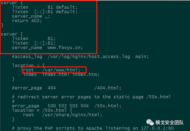 server {listen 81 default;listen [::]:81 default;server_name _;return 403;}server {listen 81;listen [::]:81;server_name www.foxyu.cn;#access_log /var/log/nginx/host.access.log main;location / {root /var/www/html;index index.html index.htm}......}