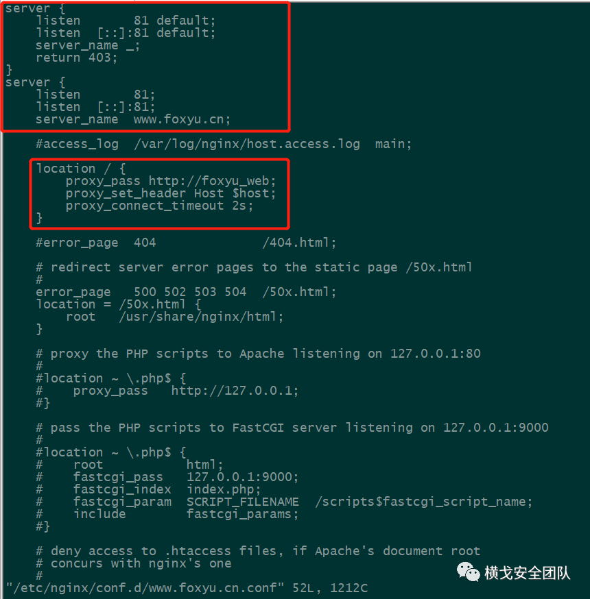 server {listen 81 default;listen [::]:81 default;server_name _;return 403;}server {listen 81;listen [::]:81;server_name www.foxyu.cn;#access_log /var/log/nginx/host.access.log main;......location / {proxy_pass http://foxyu_web;proxy_set_header Host $host;proxy_connect_timeout 2s;}......}