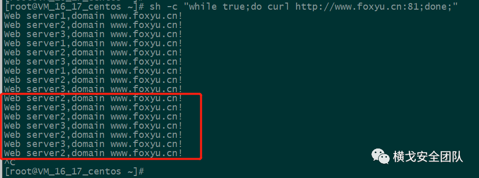 由于没有多个域名,这里直接使用ip访问模拟一个域名了,使用下面命令查看负载效果: