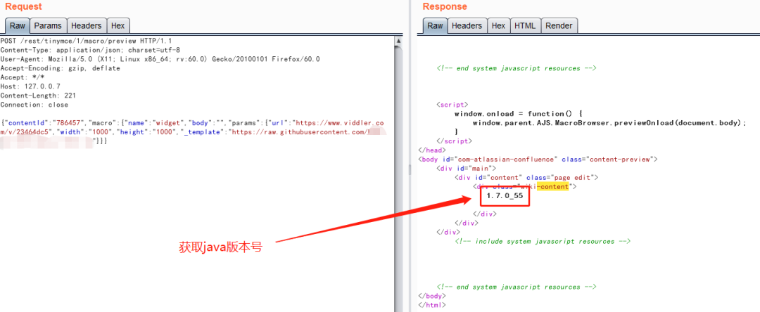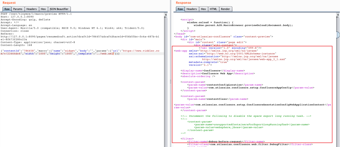 POST /rest/tinymce/1/macro/preview HTTP/1.1Host: localhost:8090Accept-Encoding: gzip, deflateAccept: */*Accept-Language: enUser-Agent: Mozilla/5.0 (compatible; MSIE 9.0; Windows NT 6.1; Win64; x64; Trident/5.0)Connection: closeReferer: http://localhost:8090/pages/resumedraft.action?draftId=786457&draftShareId=056b55bc-fc4a-487b-b1e1-8f673f280c23&Content-Type: application/json; charset=utf-8Content-Length: 176{"contentId":"786458","macro":{"name":"widget","body":"","params":{"url":"https://www.viddler.com/v/23464dc6","width":"1000","height":"1000","_template":"../web.xml"}}}