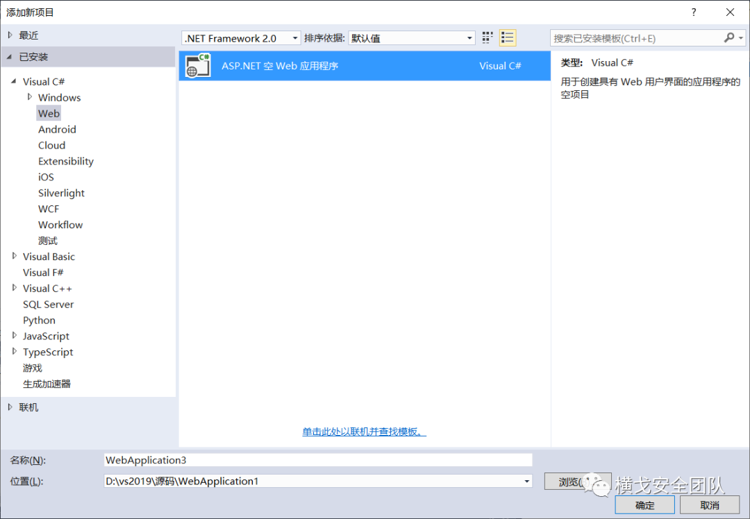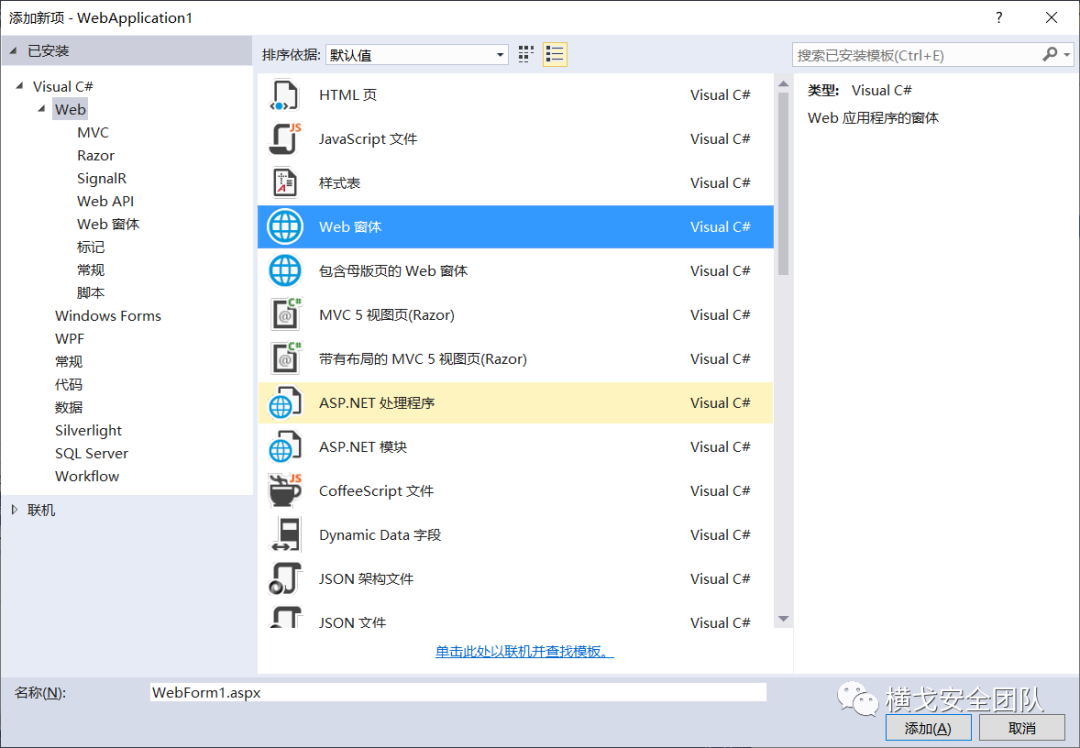 我们进行的实验都是在vs2015上创建asp.net空web应用程序,然后添加web窗体(.aspx后缀文件)进行测试,如下两图。