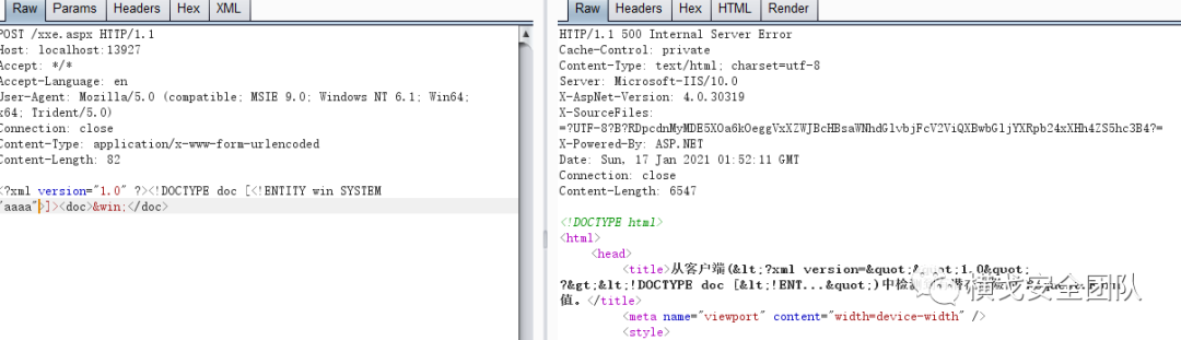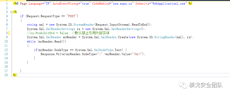 XmlReader是用于xml读取常用的一个类,我编写了以下代码进行xml读取内容,然后把结果进行输出,可以看到下面我已经做好了注释,在.net里面XmlReader是默认禁止启用引用外部实体的,修改配置“rs.ProhibitDtd = false;”的目的是开启引用外部实体。我使用.net2.0在默认的情况下,发送引用外部实体的数据包,可以发现服务端直接报错默认禁止引用外部实体。