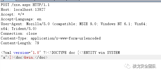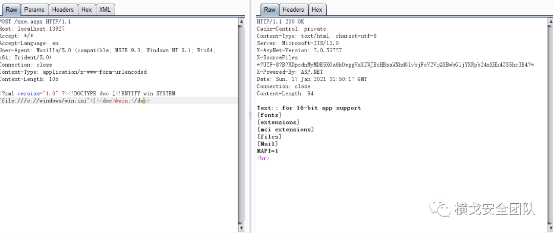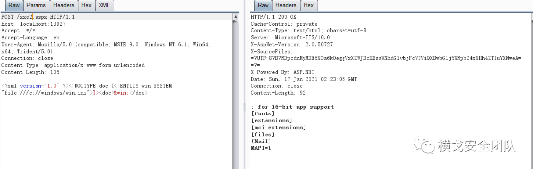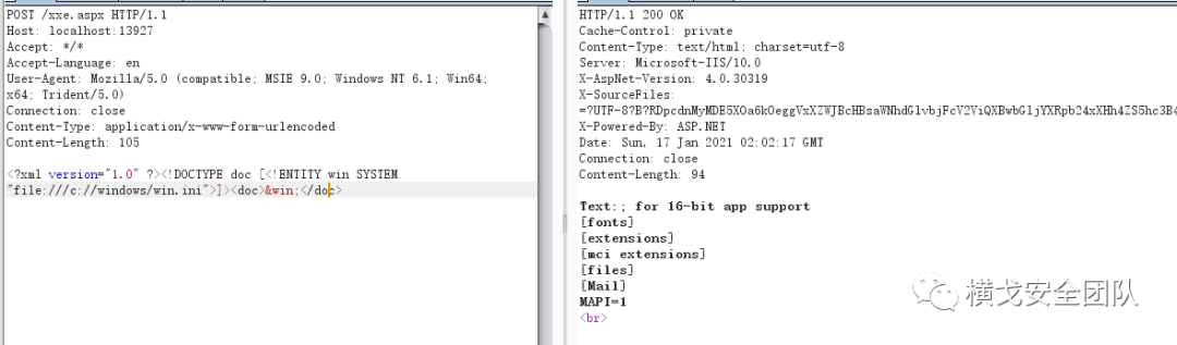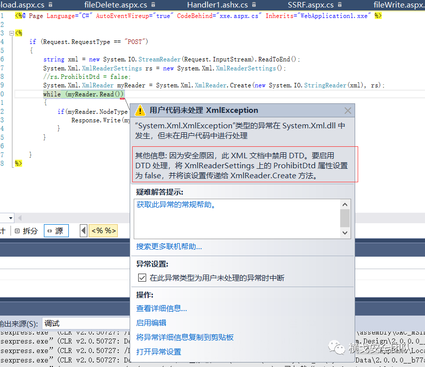此处不再叙述XXE那些原理性的东西了,原理性的东西具体可以看腾讯的文章《未知攻焉知防——XXE漏洞攻防》(https://security.tencent.com/index.php/blog/msg/69),XXE能称为漏洞最本质的是能恶意引入外部实体,也就是下面这条语句“<!DOCTYPE doc [<!ENTITY win SYSTEM "file:///c://windows/win.ini">]>”,在.net里面有好几种方式解释xml文档,但是.net高版本环境经常默认禁止引入外部实体,所以此文章以.net2.0的形式进行测试,下面就是.net4.0默认引用外部实体的演示。
