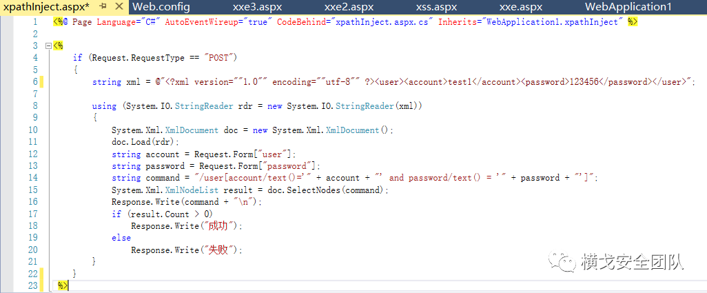xpath语法常用于使用路径表达式来选取 XML 文档中的节点或节点集,具体可以到“https://www.w3school.com.cn/xpath/xpath_syntax.asp”进行学习,我个人用得xpath语法最多就是在以前使用python进行爬虫解析html节点的时候,所以说还是应用广泛。xpath注入最本质的原理就是可以操作匹配语句,从而达到我们可以操作匹配结果,最常见的漏洞功能点应该就是进行登录的时候使用了xpath进行匹配xml文档里面的账号密码,下面我就是编写了一段这样的功能代码进行测试。