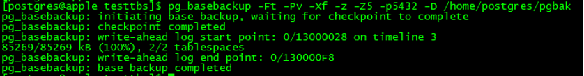 pg_basebackup -Ft -Pv -Xs -z -Z5 -p5432 -D /home/postgres/pgbak