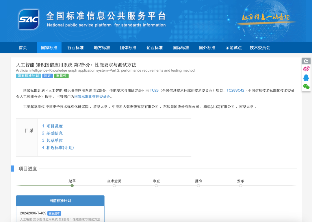 全国信标委人工智能分委会知识图谱工作组,由中国电子技术标准化研究院牵头,联合知识图谱相关企事业单位、研究院所、高校、机构,旨在开展知识图谱领域标准化顶层设计和标准化需求分析,推动国内相关标准研究、制定与推广,并支撑知识图谱相关国际标准化工作和知识工程产业的高质量发展。