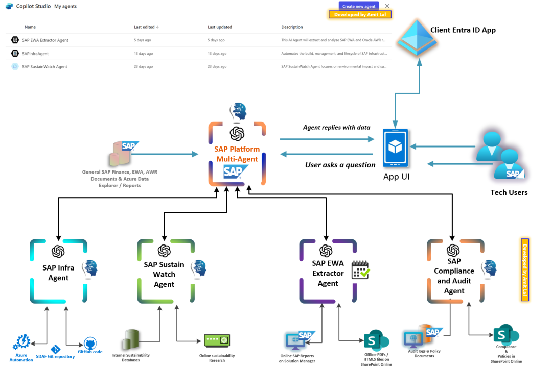 当技术用户(如SAP on Azure的工程师,或是管理SAP架构的人员)提出问题或请求时,指挥中心会立刻接手。SAP平台多智能代理从各种集成数据系统中(包括 Azure 资源、SAP 报告和公司内部数据库)获取必要的见解。它巧妙地协调各个代理,确保合适的代理来处理查询,快速返回结果,并通过应用UI将结果反馈给用户。