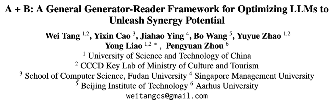 A+B: A General Generator-Reader Framework for Optimizing LLMs to Unleash Synergy Potentia。 A+B: 一种通用生成器+阅读器框架,用于优化大型语言模型以释放协同潜力。 论文链接: https://arxiv.org/abs/2406.03963 本文提出了一种名为“A + B”的通用生成器-阅读器框架,旨在优化大语言模型(LLM)并发挥其协同潜力。该框架通过将检索增强生成(RAG)中的检索阶段替换为LLM自身的生成阶段,以解决检索器性能的瓶颈问题。研究通过对基础模型和类型的不同组合进行系统研究,发现LLM的base版本和chat版本分别适合作为生成器A和阅读器B。这些组合在复杂场景下 consistently 表现优于单一模型。