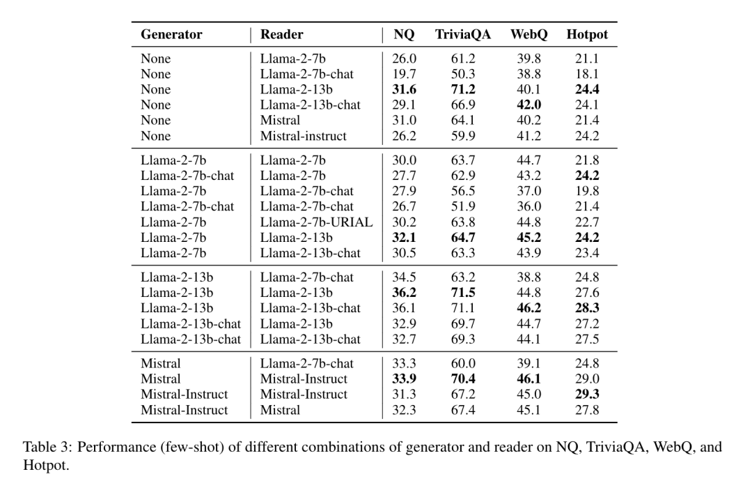 在知识密集型任务中必须考虑两个关键方面:准确的知识和高质量的生成。前者要求大语言模型生成与事实知识一致的内容,而后者则要求回答的内容既有帮助又无害,与人类偏好相符。最近,研究人员注意到微调可能会无意中削弱大语言模型传达事实信息的能力。具体而言,经过监督微调(SFT)的LLMs在评估事实知识和推理能力的基准测试中的表现较其基础模型明显下降。 这一观察引发了一个重要问题:未对齐和已对齐模型是否更适合于特定角色在知识密集型任务中,例如作为生成器和阅读器?为此,文章进行预实验,以评估不同版本的大型语言模型——未对齐和已对齐——在知识记忆和回应生成方面的表现。 预实验分为两个部分,分别是评估模型的知识记忆能力和模型的回答的有效性。实验结果来看,base模型 更能记住训练阶段的数据,而chat模型 更能生成与人类偏好相符的有效回答。 base模型 负责根据输入查询生成相关信息。需要高度的事实准确性,以确保生成的内容与事实相符。可以使用不同类型或版本的 LLM,例如未经对齐的基础模型,它们在知识记忆方面表现出色。