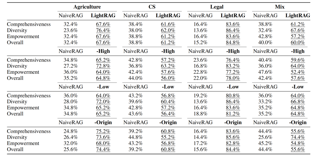 在增量数据更新方面,GraphRAG 由于其社区结构的限制,在引入新数据时不得不拆除并重新生成整个社区结构,耗费大量 token 和时间,成本极高。而 LightRAG 凭借其增量更新算法,能够将新数据无缝整合到现有的图结构中,避免了重复构建的开销,大大提高了更新效率。