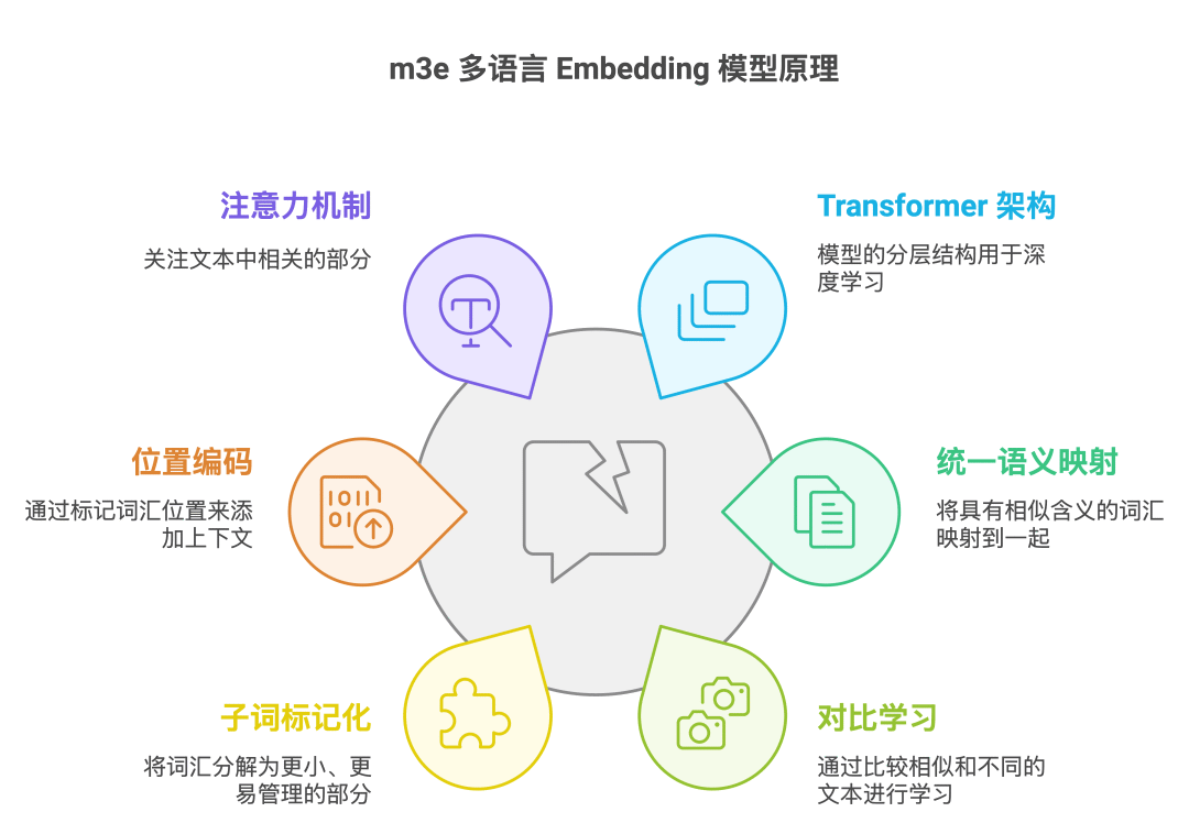 m3e 模型采用统一语义空间映射的方法来处理多语言文本。在预训练阶段,模型会同时学习多种语言的语料,让表达相同含义的不同语言词汇在向量空间中更加接近。举个简单的例子,"苹果"、"apple" 和 "りんご" 这三个词虽然来自不同语言,但因为表达同一个概念,它们在向量空间中的位置会非常接近。