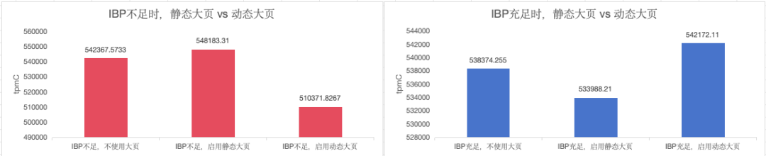 当 IBP 充足时,内存资源不是瓶颈,不需要频繁分配和回收,此时启用动态大页的整体性能更好。 当 IBP 不足时,内存资源成为瓶颈,可能需要频繁分配和回收,此时启用静态大页的整体性能更好(相对于启用动态大约tpmC约高出7%)。 当 IBP 充足时,启用静态大页的性能反倒较低。 反过来,当 IBP 不足时,开启动态大页的性能较低。